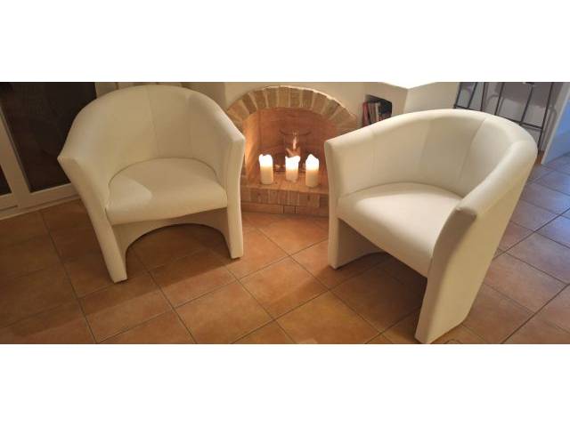 Se ofrecen 2-4 butacas tipo cóctel en polipiel blanca. Son nuevas y se venden porque nos equivocamos con el tamaño. Queremos 80 euros por butaca. Las butacas están cerca de Cala Millor.