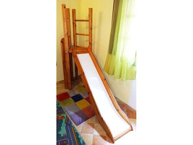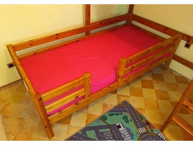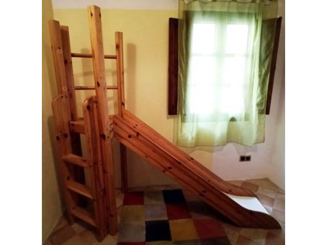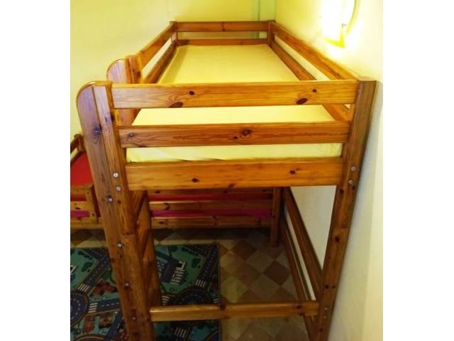 Vende una combinación de litera / cuna de madera maciza con tobogán, dos escaleras y dos colchones nuevos.