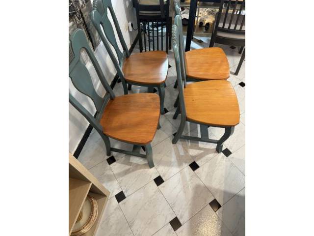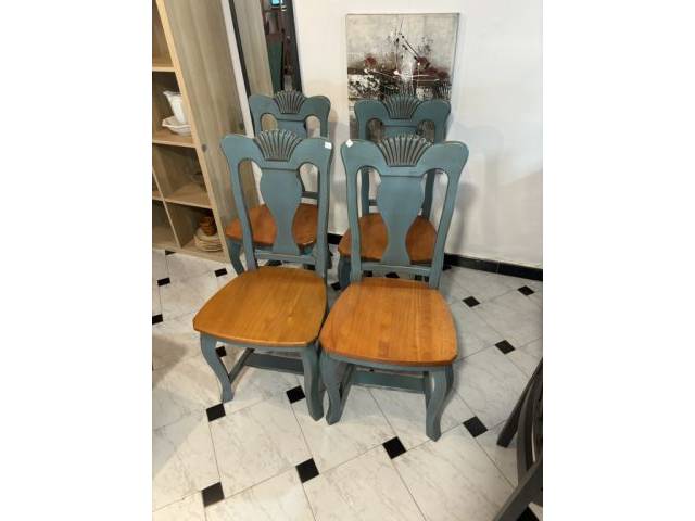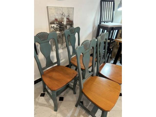Elegantes sillas de madera maciza con asiento en tono natural y estructura pintada en un bonito color verde azulado envejecido. Su diseño con respaldo tallado aporta un toque clásico y distintivo, ideal para comedor, cocina o espacios con estilo rústico o mediterráneo.