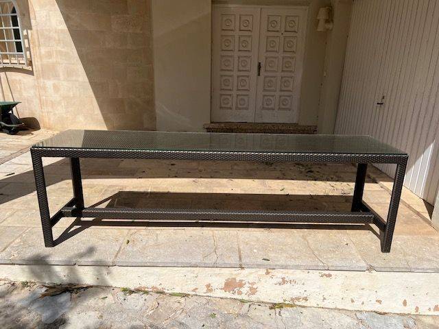 Una mesa de ratán DEDON con tablero de cristal en estado impecable, como nueva. Nunca ha sido usada. Largo 250 cm, ancho 60 cm, alto 75 cm. Precio negociable.