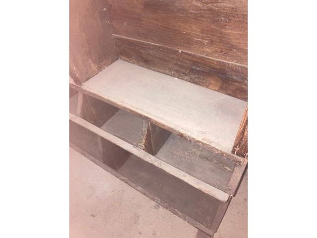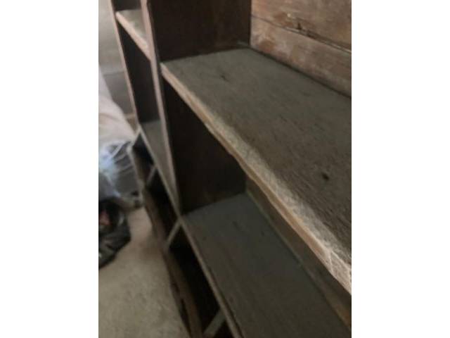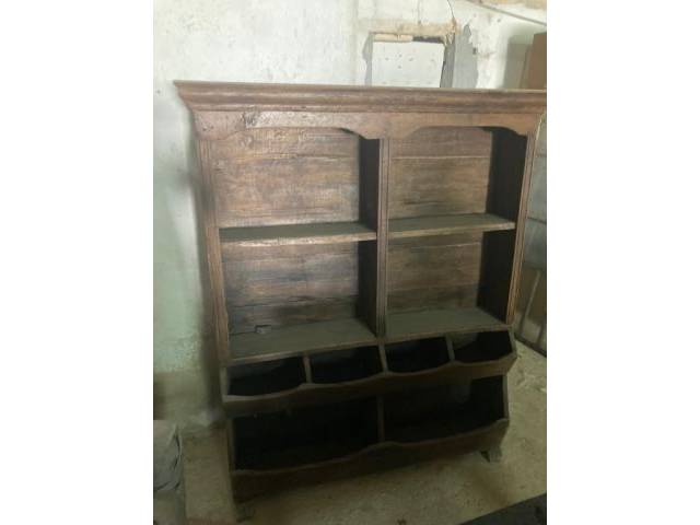 Aquí se vende una antigua estantería de armario, que probablemente todavía se construyó a mano. Probablemente sea tan viejo como parece. Los agujeros de gusano son originales, pero la madera está desparasitada químicamente. Con éxito, como puede ver, porque de lo contrario la harina de madera también se encontraría sobre o entre la capa de polvo.