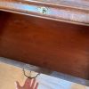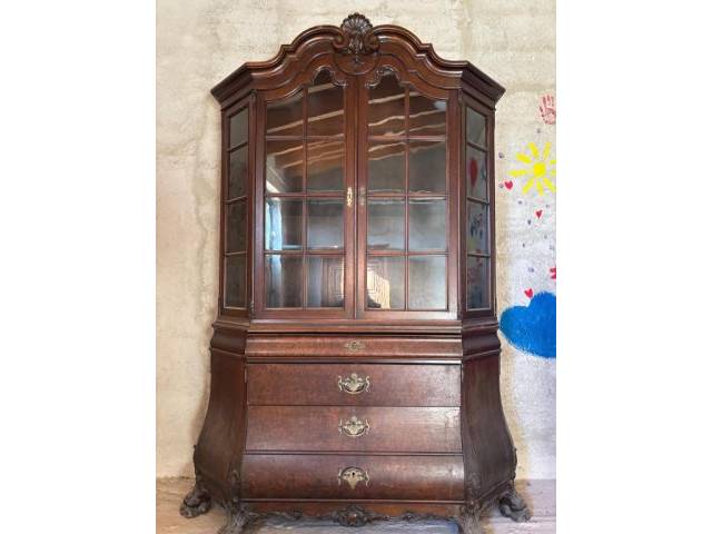 hermosa pátina, forma abombada y dinámica (cuerpo de cómoda), tallado elaborado (en la base y en los pies, volutas típicas del barroco), herrajes de latón originales, vitrina de vidrio en la parte superior con cristales subdivididos varias veces (ventana de cuarterones), frontón ondulado con adorno tallado en el centro (motivo de concha, influencia rococó), madera de alta calidad