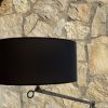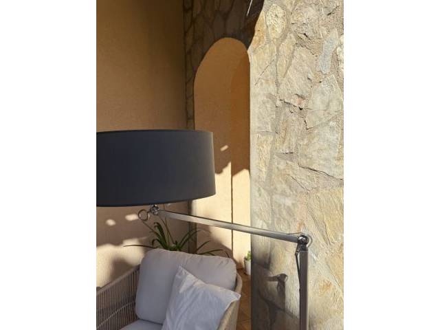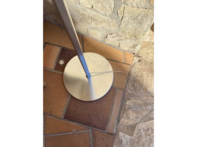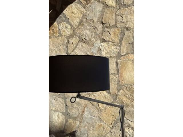 En venta: una lámpara de pie muy estable con brazo ajustable y una gran pantalla de tela negra. El brazo se puede colocar de forma flexible en distintas posiciones — ideal, por ejemplo, junto al sofá o sobre un sillón de lectura. La lámpara tiene una base pesada y de alta calidad de metal cepillado y, en conjunto, resulta sobria y funcional.