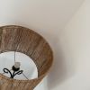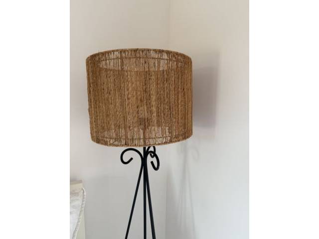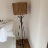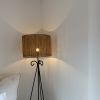 Lámpara de pie decorativa con un marco de metal elegantemente curvado y una pantalla hecha a mano con un aspecto natural.
