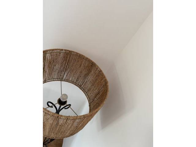 La lámpara mide 157 cm de altura y proporciona un juego de luces cálido y acogedor en la pared gracias al material de la pantalla.