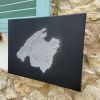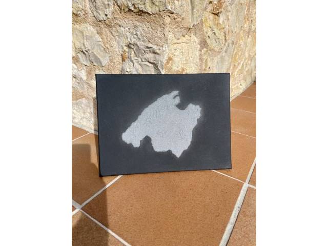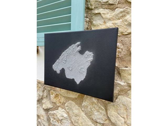 Vendo una extraordinaria imagen de Mallorca. La isla está trabajada como un relieve de arena en plateado sobre lienzo negro. Dimensiones: aprox. 40x30 cm. Pieza única.