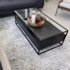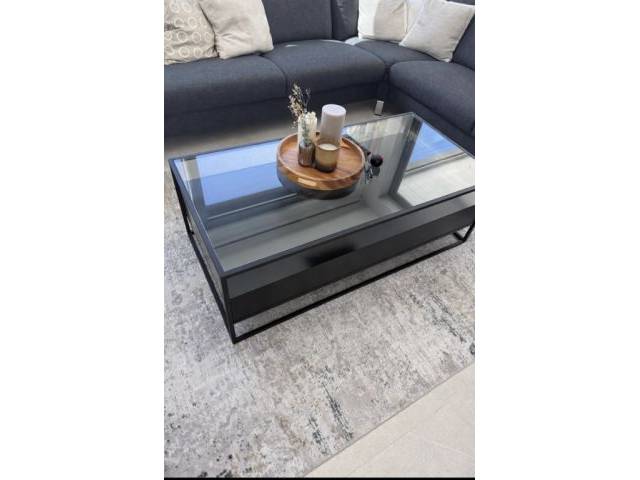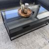 Mesa de centro con armazón de aluminio negro y cuerpo de madera negro, incluye dos cajones. La superficie de la mesa es una placa de vidrio.