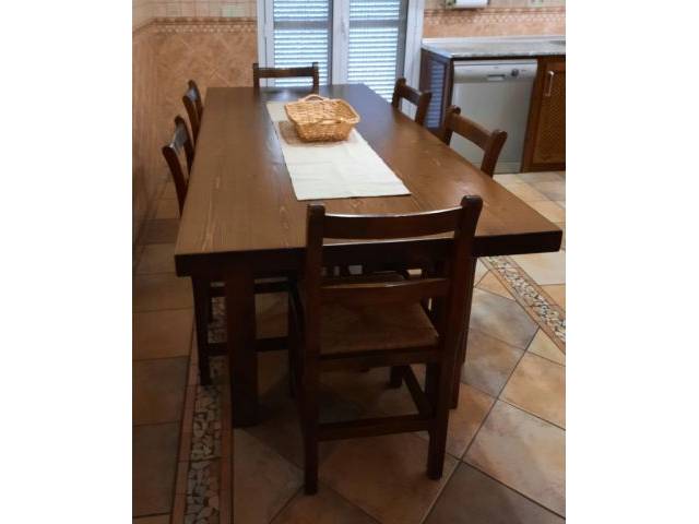 Esta mesa de comedor (longitud aprox. 210 cm) está hecha de madera maciza; pesa considerablemente más que un quintal. El transporte requiere varios ayudantes y un remolque o un vehículo más grande. Debido a su fabricación y dimensiones, es adecuada para una terraza de finca. Recogida en Porto Cristo Novo. ¡Sillas con asiento de mimbre incluidas!