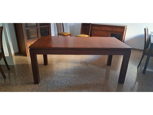 No extensible, para 8 comensales cómodamente sentados. Dispone de 6 sillas de respaldo alto, con tapicería color amarillo, fácil de cambiar.