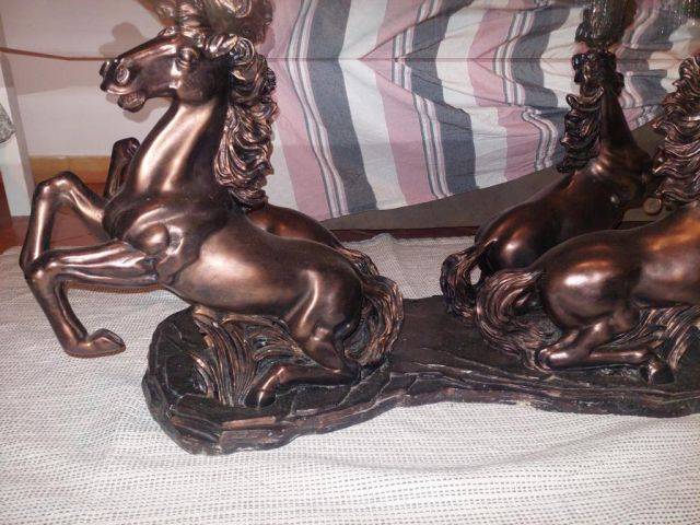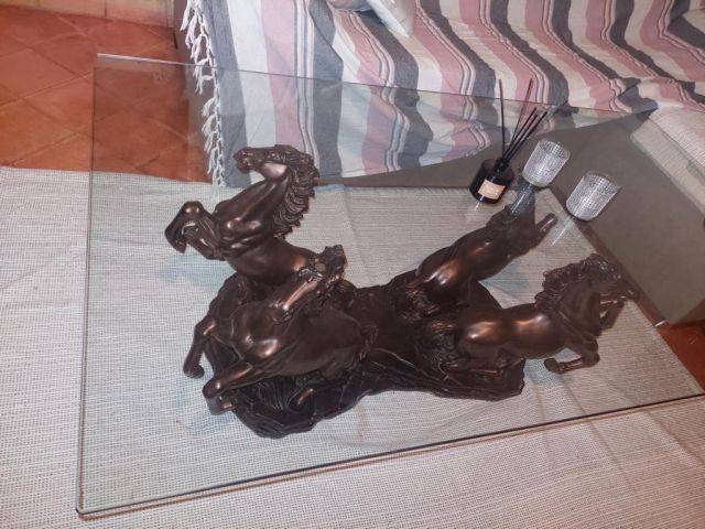 Mesa de cristal - compuesta por una placa de vidrio 1,80 x 0,80, apoyada sobre una base pesada que representa 4 caballos.