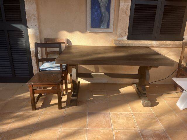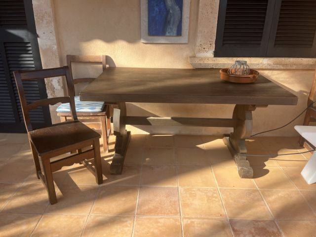 Es una mesa pesada (unos 150 kilos), de madera maciza con seis sillas a juego...