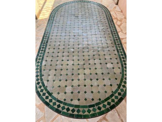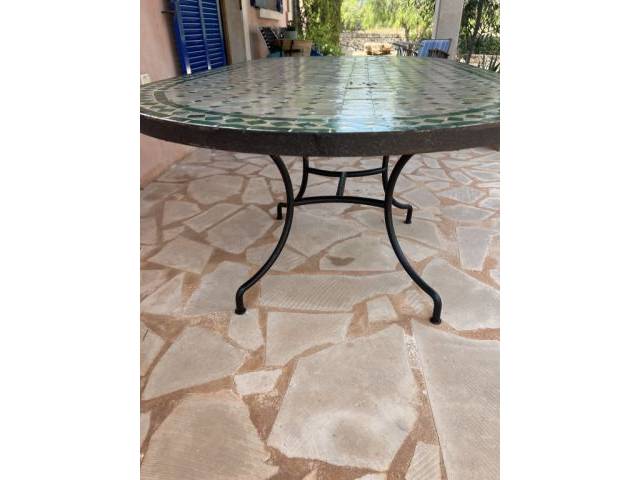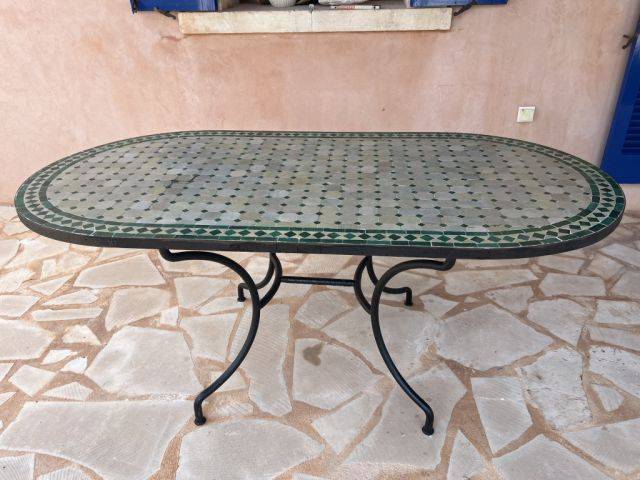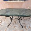 Hermosa mesa de mosaico marroquí con robusto marco de hierro, ovalada longitudinal de 180 × 90 cm, usada, pero en buen estado para su colección en Santanyí