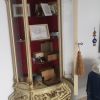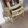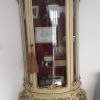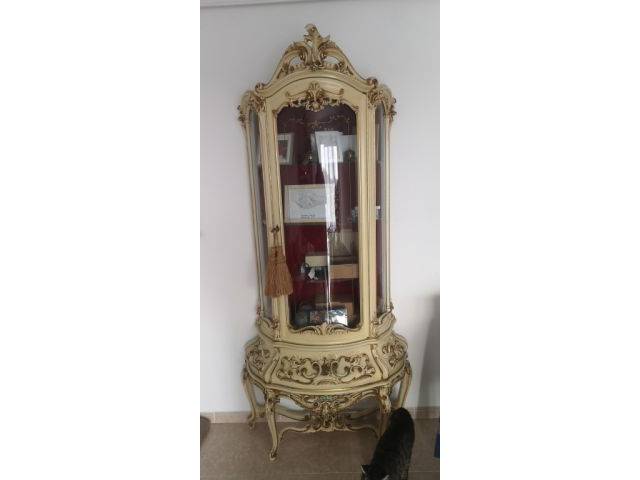Se trata de una vitrina de estilo barroco veneciano con pintura color crema y tallas doradas.