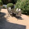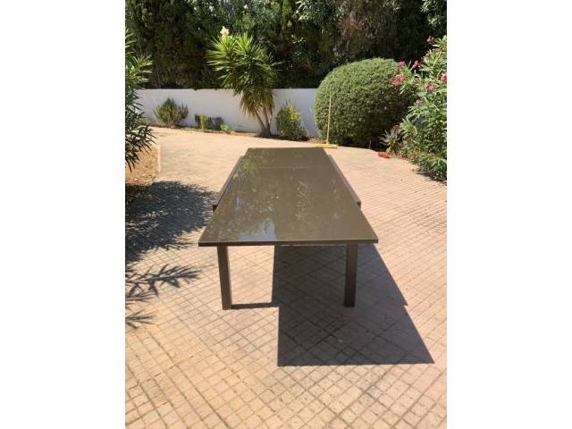 La mesa es ajustable en tamaño, extendida mide 250 cm de largo y 150 cm de largo en condiciones normales. También mide 90 cm de ancho y 75 cm de alto.