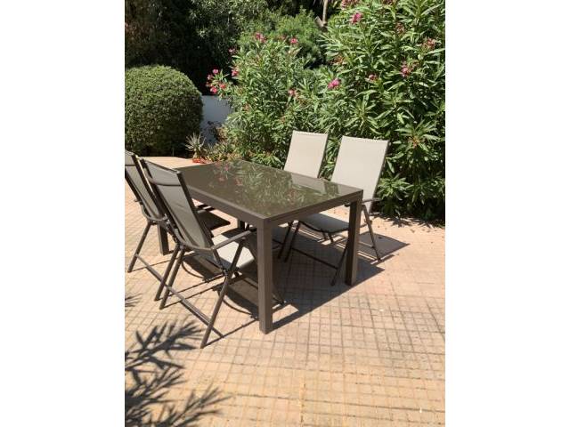 La mesa tiene 6 sillas, dos de las cuales tienen pequeños daños, como un agujero quemado y otra silla se corta un poco. 4 sillas están en las mejores condiciones y todas son utilizables.