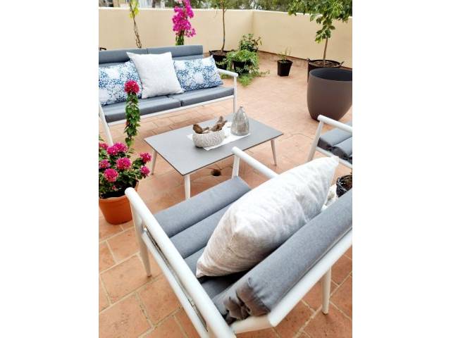 Vendo un conjunto de asientos en blanco, pintado con pintura en polvo, resistente a la corrosión, con cojines grises, compuesto por una mesa, 2 sillones y un banco....