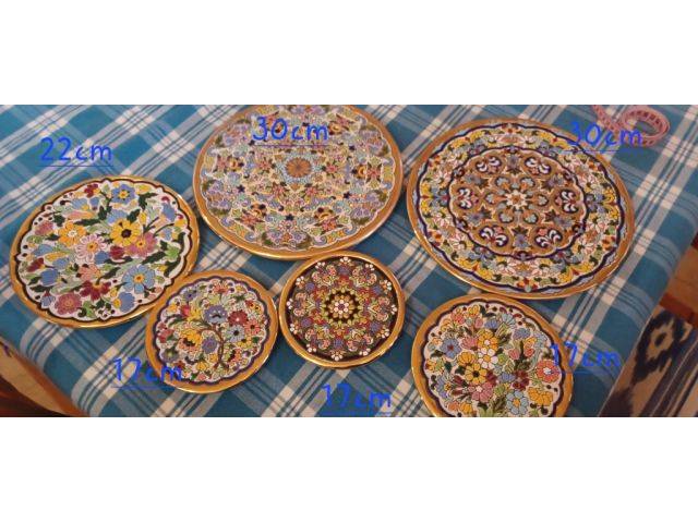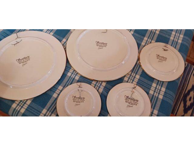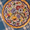 Plato esmaltado a mano con oro de 24 kilates.decorado con un diseño inspirado en Sevilla. Presenta un borde dorado y un patrón floral colorido.