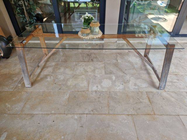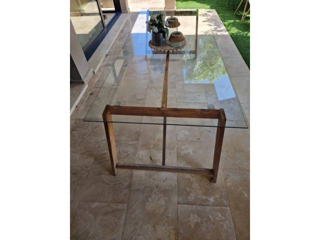 Vende una mesa rectangular de vidrio con un marco de madera. Estado muy bueno, estructura de madera en buen estado, por lo que tenemos la mesa en la terraza, se puede ver eso por supuesto.