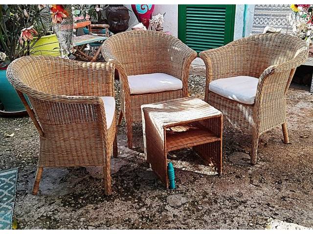 3 sillas de mimbre natural Gunter Lambert con cojines (fundas lavables) y una mesita auxiliar!! 180 € el conjunto, móvil 659 637 788 (¡Todos los transportes/mudanzas pueden realizarse!!)