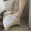 Precioso y cómodo sillón de ratán en color beige con cojín de asiento en venta en Cala Ratjada. Las dimensiones son: altura del respaldo 100 cm, ancho 66 cm, profundidad 80 cm, altura del asiento sin cojines 36 cm y con cojines 44 cm, profundidad del asiento 58 cm y ancho 54 cm. Hay 2 disponibles. El precio es por sillón.