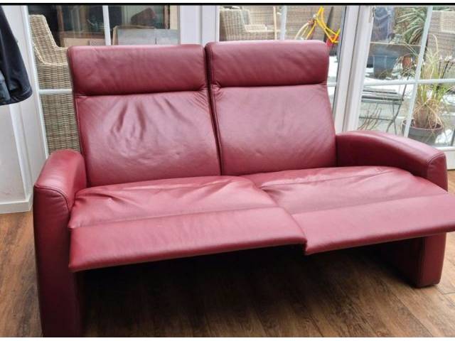 La pieza de mobiliario es un sofá de dos plazas de alta calidad de la marca Himolla. Se trata de un modelo de cuero auténtico de color rojo oscuro, conocido por su durabilidad y comodidad.