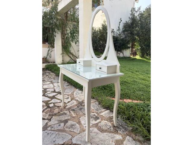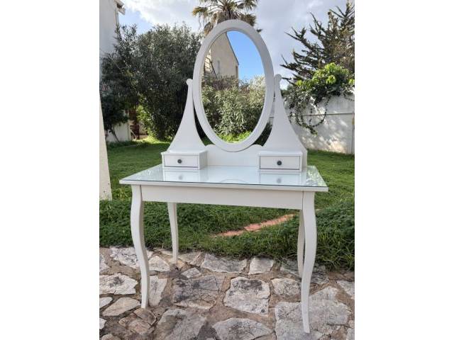 Elegante y funcional tocador blanco de IKEA, ideal para dormitorios o vestidores. Su diseño moderno y minimalista aporta luz y orden al espacio. Cuenta con una superficie amplia y cajones prácticos para organizar maquillaje, accesorios o productos de cuidado personal.