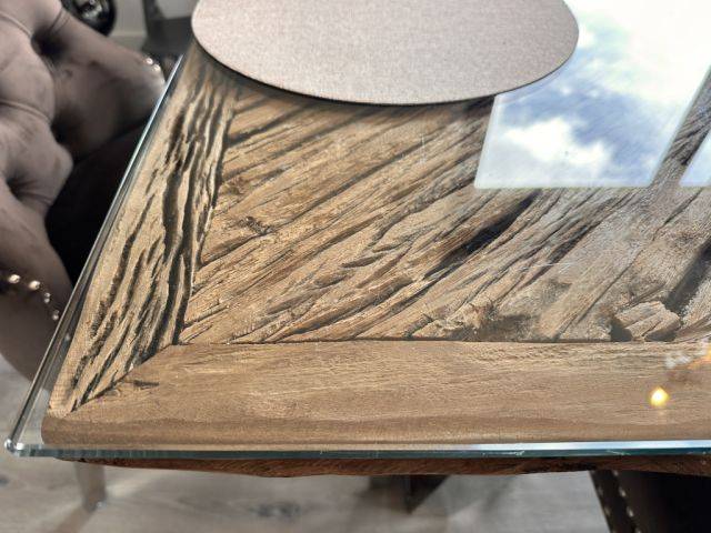 La mesa está hecha de madera maciza y tiene una elegante cubierta de vidrio. Las patas de la mesa son de hierro resistente. Muy robusta y duradera.