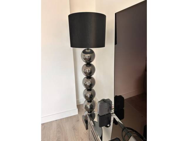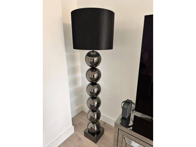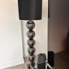 La lámpara de pie destaca por su base extraordinaria compuesta por varias esferas cromadas en acabado humo y una elegante pantalla negra. Un llamativo elemento de estilo para el salón o el dormitorio.