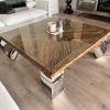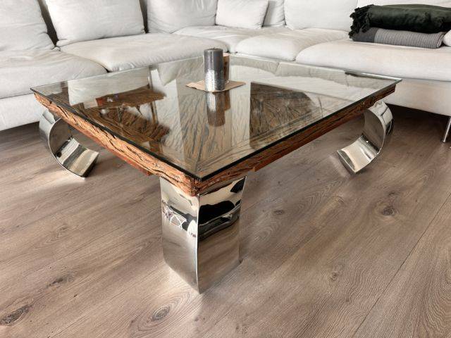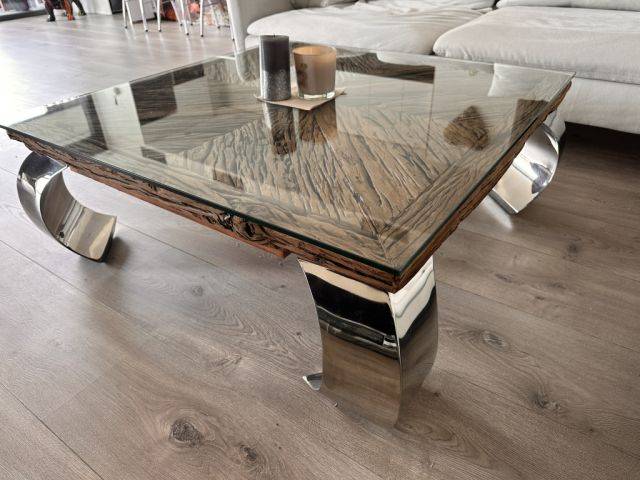 La mesa está hecha de madera maciza con una elegante tapa de vidrio. Las patas están fabricadas en hierro resistente y le dan a la mesa un diseño moderno y exclusivo. Muy robusta y duradera.