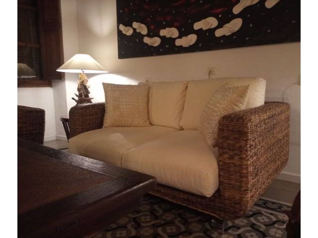 En venta, bonito ejemplar de exposición, NUEVO / sin uso. Sofá de diseño modelo SADLER, 2 plazas (Loveseat), estructura metálica, tejido de jacinto de agua natural, tapizado con tela de algodón, color crudo (ecru), desenfundable / lavable, patas de acero pulido, 157 x 98 x 70 cm, para interior o exterior cubierto. Listo para recoger en el pueblo de Llucmajor, entrega en la isla disponible por una tarifa. Precio nuevo: 2100.00€, precio pieza de exposición: 925.00€