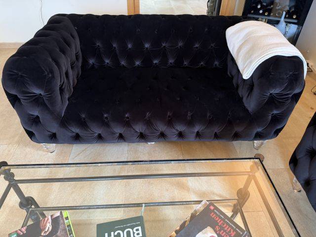 un sofá de 2 plazas y un sofá de 3 plazas. Es una tela aterciopelada, suave y negra y invita a relajarse cómodamente.