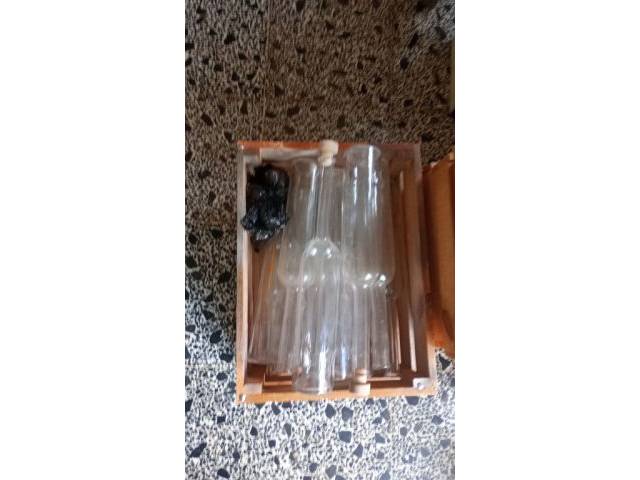 Vendo botellas de vidrio, 0.7, sin usar (polvorientas), con corchos. 2€ cada una. Caja de madera con 17 botellas y corchos 25€