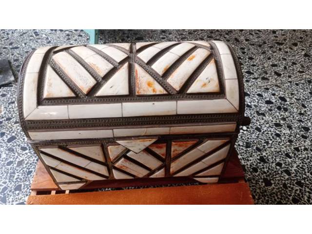 Caja de joyas vintage. Madera, latón, hueso.