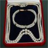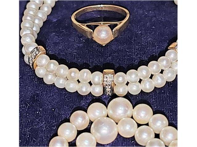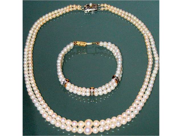 El collar y la pulsera son de doble fila con cierre de plata de ley + perlas en el collar y la pulsera con cierre de oro de 8 quilates. Los tres espaciadores del brazalete también están hechos de oro de 8 quilates. Todo está marcado.