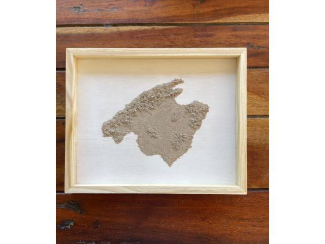 Vendo dos cuadros de Mallorca. La isla está trabajada como relieve de arena (oro/natural/blanco) sobre fondo gris o blanco con marco de madera (oro/natural/blanco). Dimensiones: aprox. 30x24 cm. Cada uno es una pieza única.