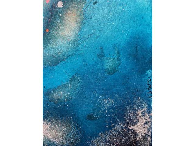 Su estilo se caracteriza por las texturas, la técnica mixta sobre lienzo y el uso de pigmentos dorados y plateados. Inés se esfuerza por capturar momentos precisos: tomas aéreas de océanos en movimiento, ondulantes playas salvajes, inmersiones en increíbles fondos marinos, la luna llena en su fase más mágica, impresionantes cielos rosados y una paleta neutra que evoca pedazos eternos del cielo.