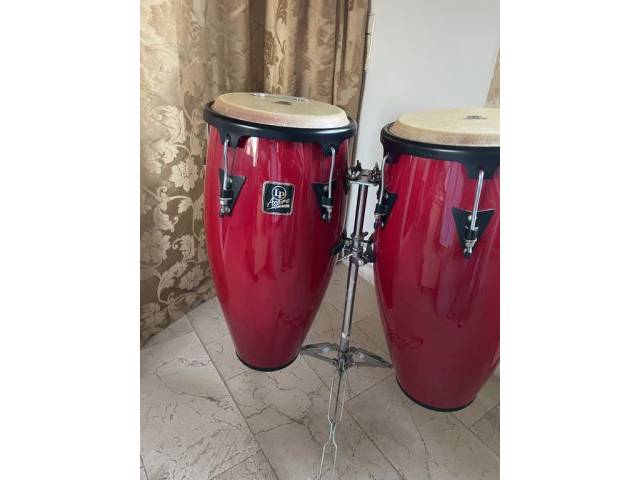 Las congas tienen un sonido estupendo. Se venden tal como aparecen en las fotos, con un soporte a juego y una llave para ajustar la piel. Diámetro (10 y 12 pulgadas), que corresponde a 30 cm y 27 cm. Miden 70 cm de alto. ¡Solo recogida!