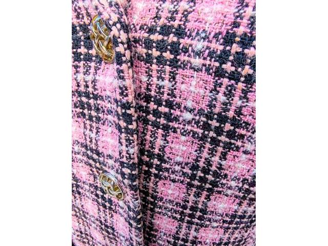 con hilos dorados brillantes visibles que le dan al tejido de tweed un toque festivo.