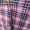 Diseño: El blazer tiene un diseño clásico con solapa, dos botones en la parte delantera y un forro interior negro continuo. El estampado de cuadros combina tonos rosa y negro.