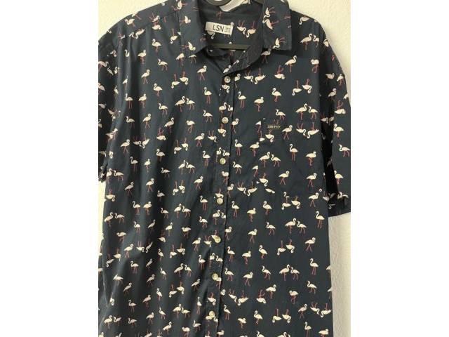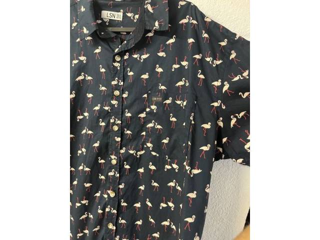 Ofrezco una elegante camisa de manga corta flamingo para hombre en excelentes condiciones de un hogar no fumador, perfecta para ocasiones agradables con un toque de diversión y elegancia.