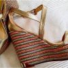 Material y color: Las sandalias cuentan con tiras de cuero metalizado dorado y una suela de cuña con rayas en tonos dorado y cobre/rosado, a menudo hechas de esparto o yute trenzado.