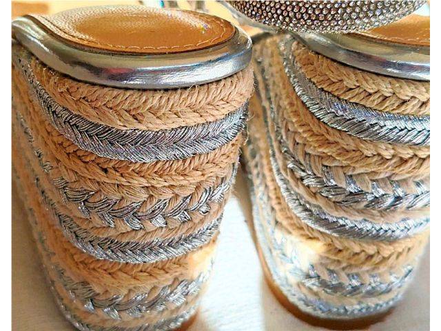 Detalles: adornos de strass en las tiras, suela de cuña de yute trenzado