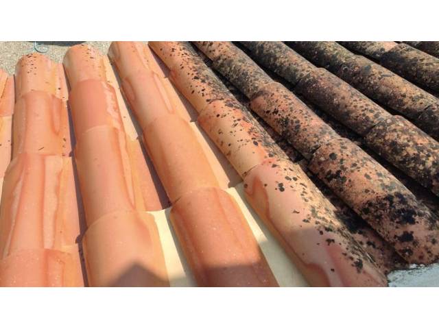 Sin alta presión. Nuestro método elimina las algas, los musgos, la suciedad y los escombros, y protege la superficie a largo plazo.