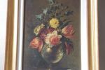 Cuadro decorativo con una pintura de un jarrón. El parpastú blanco tiene una esquina agrietada. El cuadro mide 46cm de ancho por 56cm de alto.