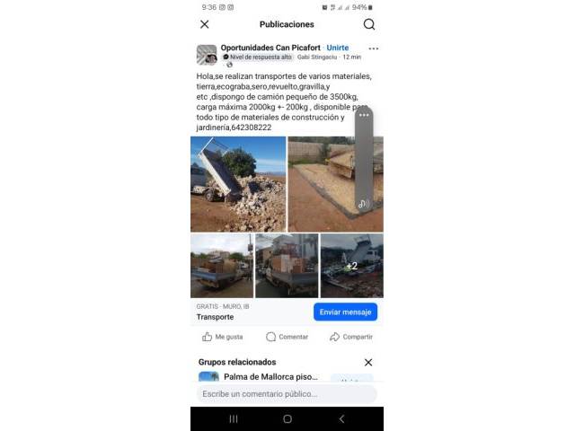 Hallo! Ich biete Transport auf ganz Mallorca an, kleiner Lkw von 3500kg, sero, revuelto, tierra gribada usw., ich mache auch kleine Umzüge, wenn du möchtest, kannst du dich an 642308222, Gabriel, wenden.