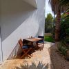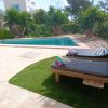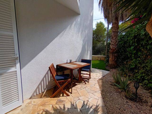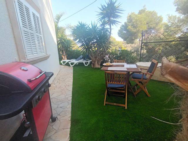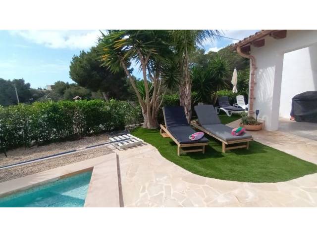 Es befindet sich in einem ummauertem und eingezäuntem Eckgrundstück von ca. 350 m2 und hat ein Einfahrtstor um auch das Auto innen parken zu können. Desweiteren gibt es eine überdachte Terrasse neben dem Garten und dem Dreieckspool, welcher ca. 15 m2 gross und 2 m. tief ist. 2 weitere Terrassen, die sich in 1. Etage befinden ( eines mit Sonnenschirm ), bieten einen herrlichen Meerblick mit schönen Morgensonnenaufgängen - Ostorientiert.