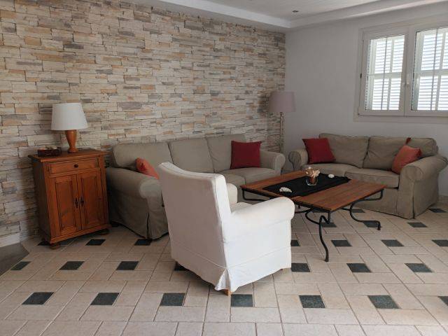 Ausstattung: Weiße Keramikfliesenböden mit dunkelblauen Kacheln, Doppelverglasung mit Kippfenstersystem, Holz- und Aluminium-Jalousien, SAT TV und Firestick zum Einloggen, WLAN von IB-RED von 7 Mb, Zentral AC und Fussbodengaszentralheizung, 2 Feuerlöscher, Stadtwasser und Osmoseanlage ( Trinkwasser ) und GESA Strom, DVD Player, Abwassergrube, Heißwasser über elektrische Therme. 100 % modern möbliert ( Bügelbrett und Haartrockner vorhanden). Babystuhl und Bett bei Bedarf verfügbar.