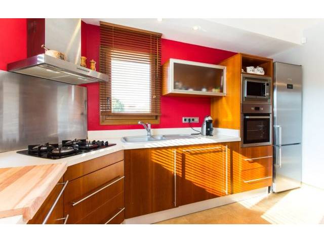 Gegenüber dem Eingang gelangt man in das grosse Wohnzimmer mit angrenzender Einbauküche welche mit Gaskochflächen, elektrischer Backofen, Kühlschrank, Geschirrspüler, Mikrowelle, komplettes Kücheninventar ausgestattet ist. Eine Waschküche mit Waschmaschine liegt nebenan.