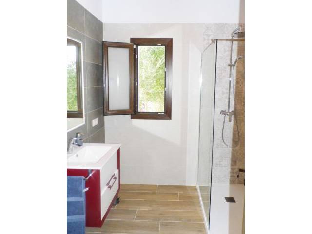 Zimmer: Parterrefinca von ca. 170 m2 Wfl. ist im Jahre 2018 erbaut worden und bietet einen Eingangsbereich welcher zum dem geräumigen Wohn,- Esszimmer mit offener Einbauküche führt. Diese hat eine Arbeitsinsel und ist mit allem notwendigem Komfort und Geräten für den Aufenthalt von 6 Personen ausgestattet . Nebenanliegend befindet sich eine Waschküche mit Waschmaschine, 1 Badezimmer mit Dusche, 1 Doppelzimmer mit Einbauschrank und 2 Doppelzimmer mit Einbauschränken und Badezimmer mit Dusche en Suite.