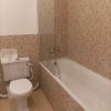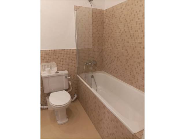 Auf der gegenüberliegenden Flurseite verfügt das geräumige Badezimmer über eine große Badewanne und eine Dusche. Darüber hinaus sind Waschmaschine und separater Trockner praktisch in einem unauffälligen Schrank untergebracht, wodurch der Raum ordentlich bleibt und die Wäsche einfach zu handhaben ist.